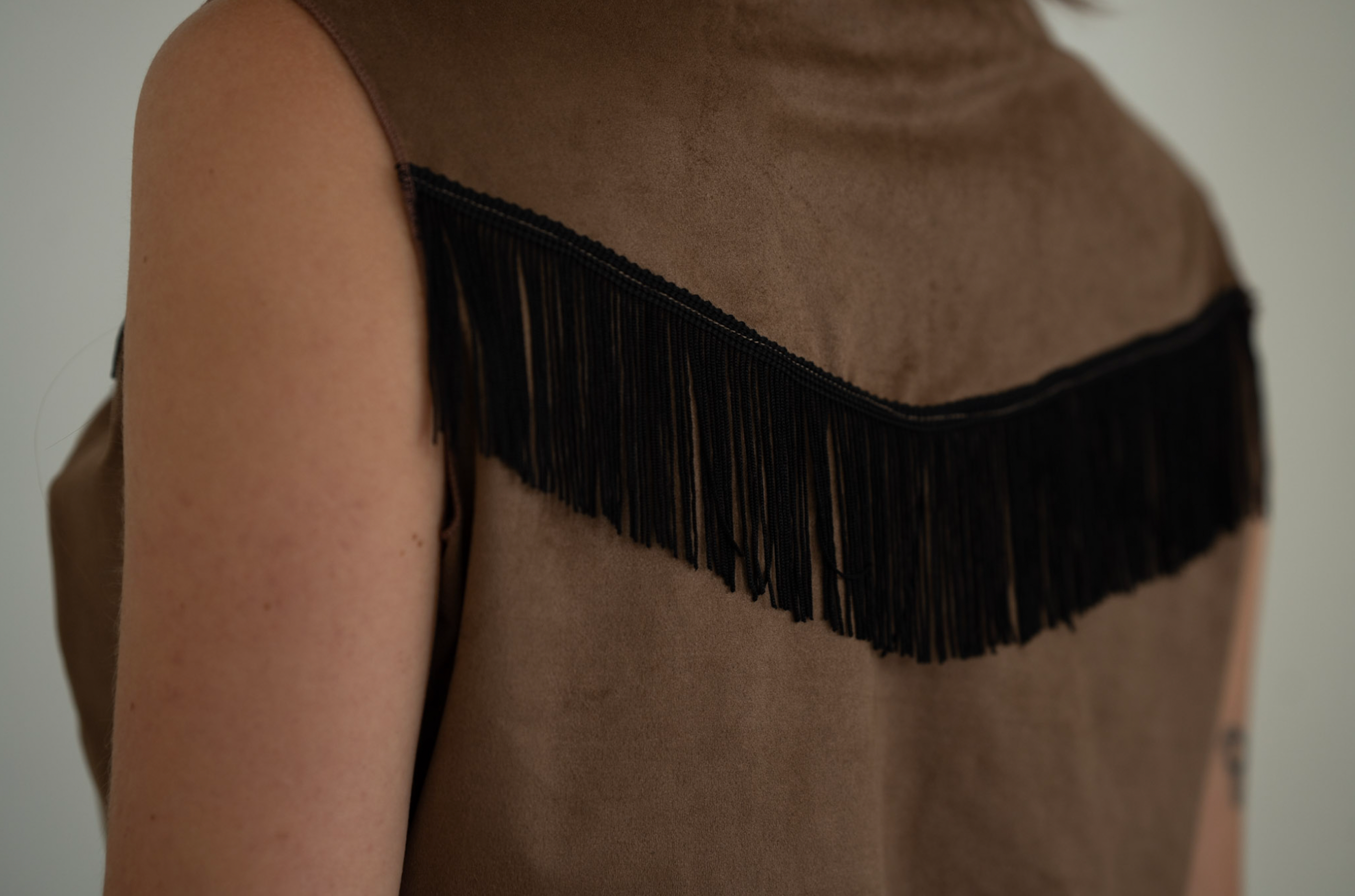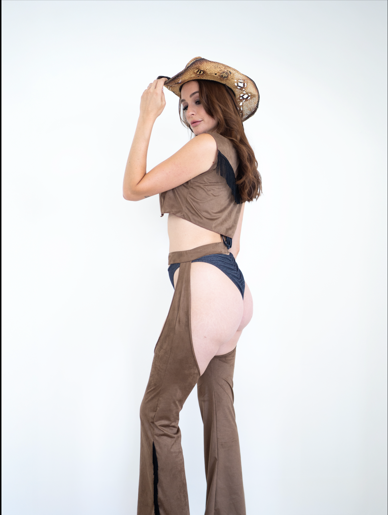 Des chaps ouvertes en effet suédine : toucher doux, coupe évasée, et look western irrésistible